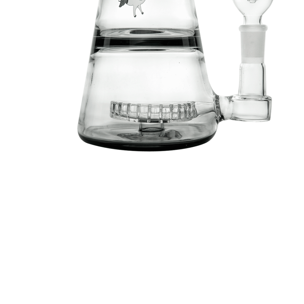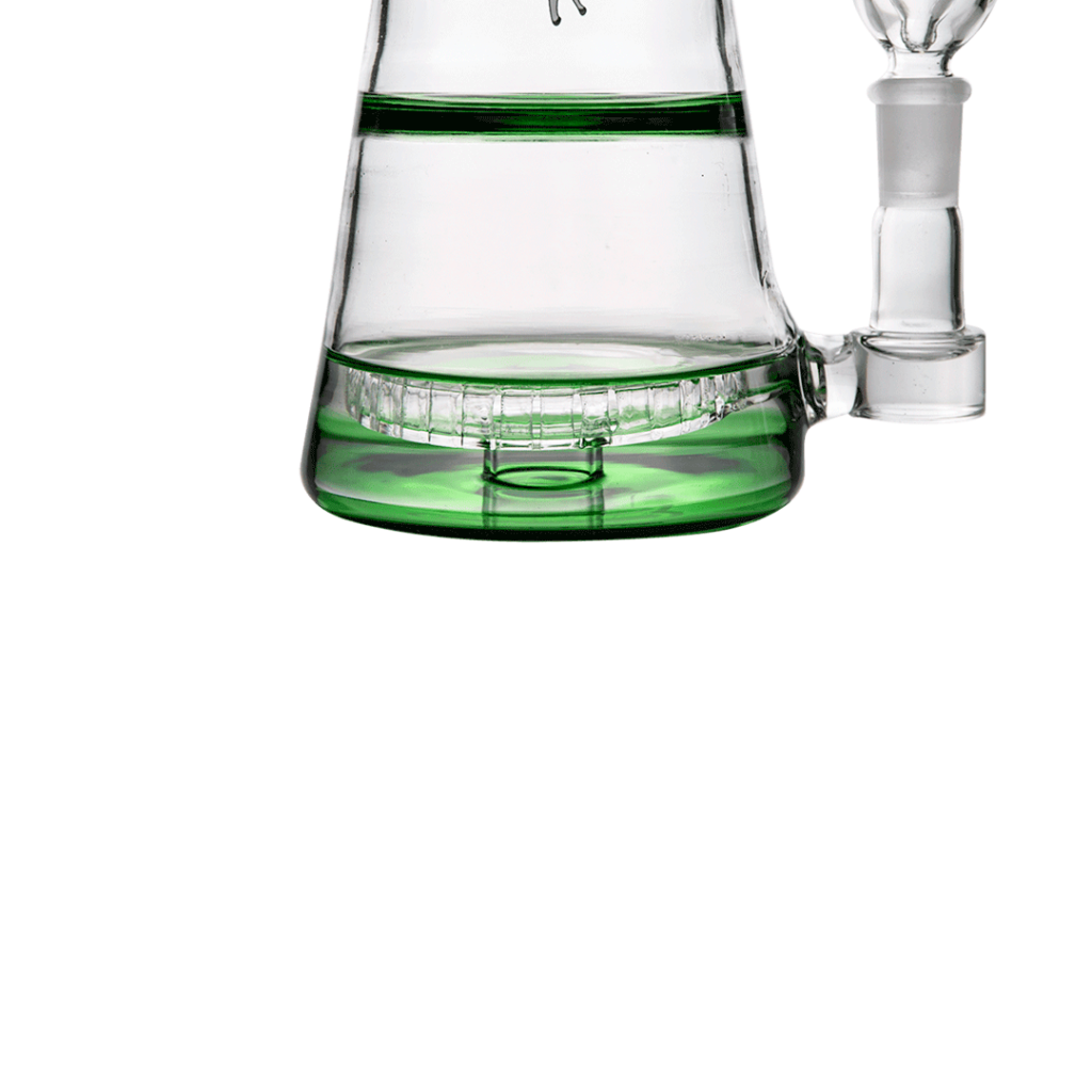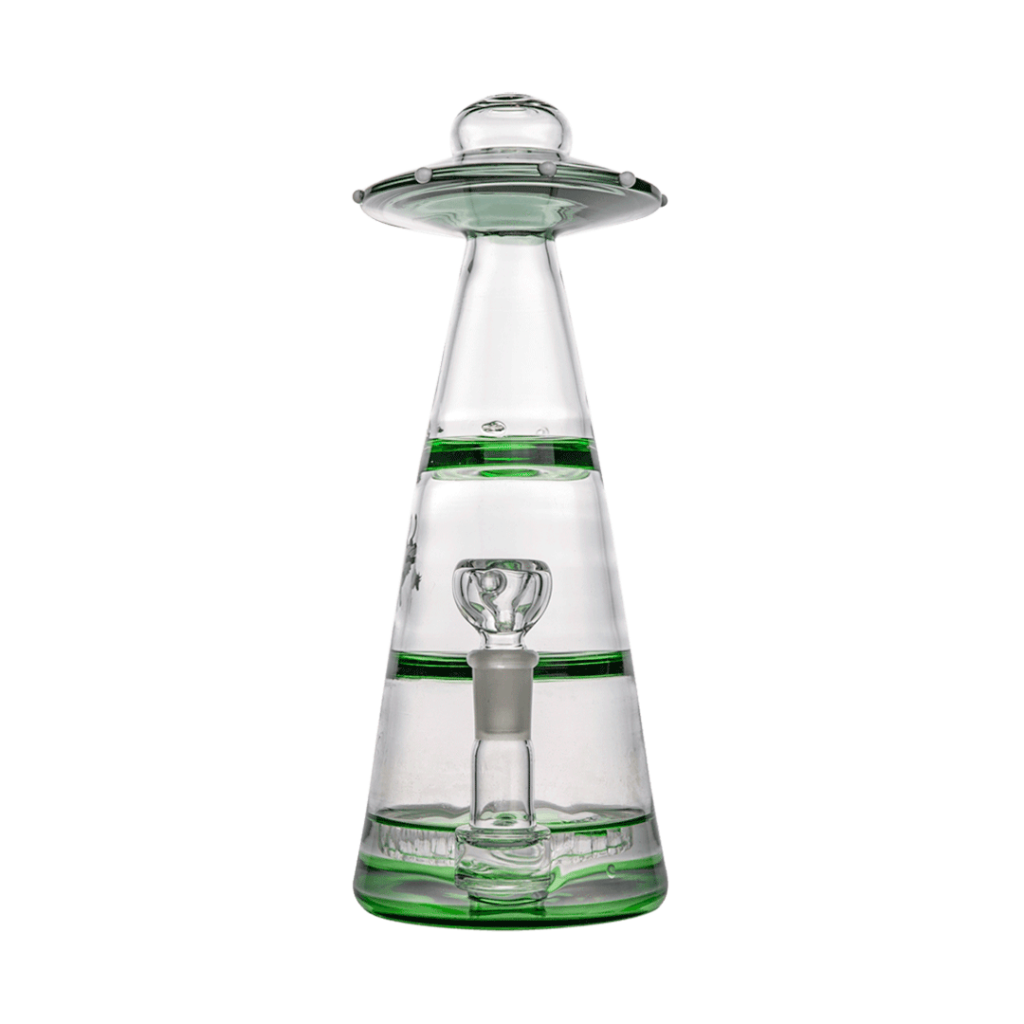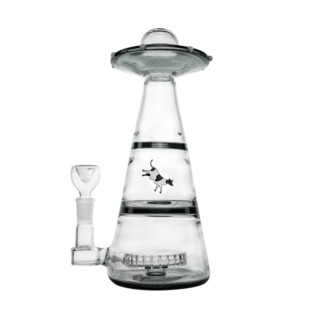 Here she is – behold the “Mothership”! This UFO bong is the larger edition of our UFO Vortex rig, made larger with an extra chamber for huge flower rips! We’ve added our inline percolator to push smoke bubbles up into a vortex chamber that spins and cools the smoke for a smoother hit. The added venturi inlets cause smoke to spin creating a cyclone effect that you can watch!